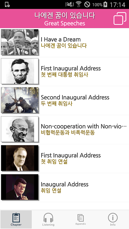 세계적으로 유명한 주옥같은 연설문들을 모아 관련 사진 및 그림과 함께 실었다. 각각의 연설문 말미에는 이 훌륭한 연설을 있게 한 사회적 역사적 배경에 대한 짧은 소개도 나와 있다.