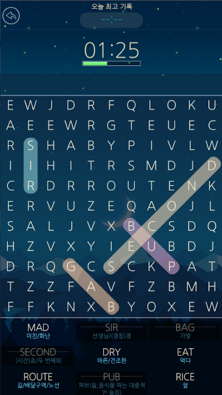 - 도전 모드 : 제한 시간내 단어를 빨리 찾아 다른 유저와 순위를 겨루는 방식