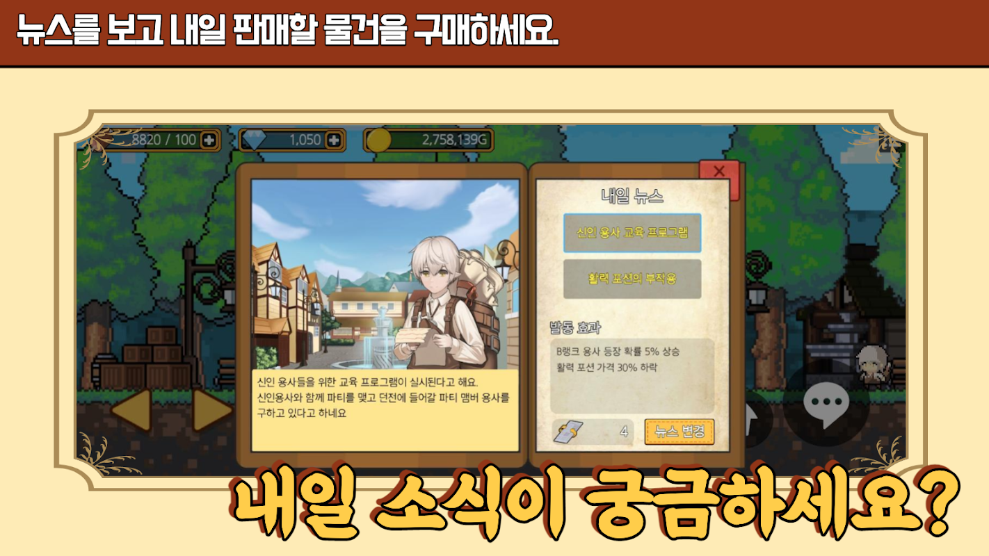 뉴스 소년에게 내일 뉴스를 듣고 필요한 아이템을 예측해서 팔아보세요.