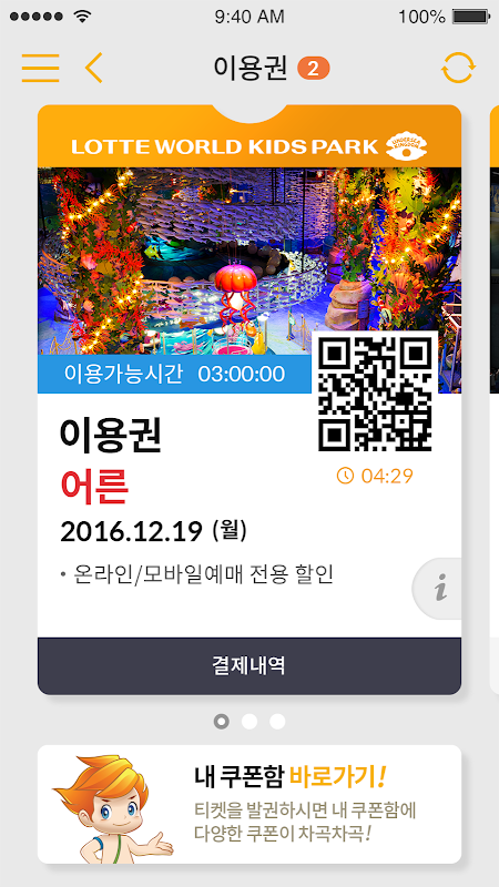 키즈파크 최초! 예매,발권,추가정산까지 모든기능이 하나로 뭉친 롯데월드 키즈파크 애플리케이션! 이젠 키즈파크도 스마트하고 편리하게 즐겨보세요.
