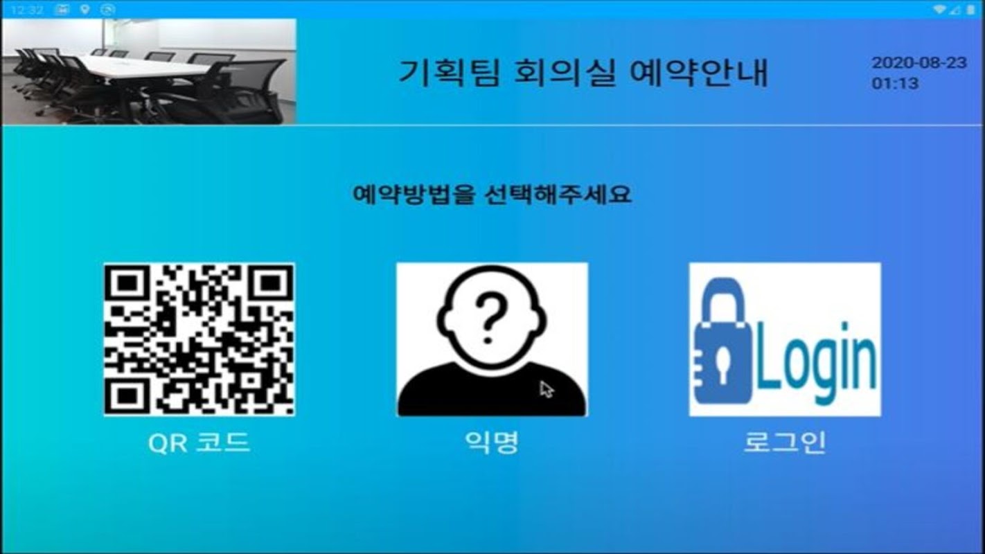 회의실 앞에 배치될 태블릿 버전의 회의실 예약관리 앱입니다.