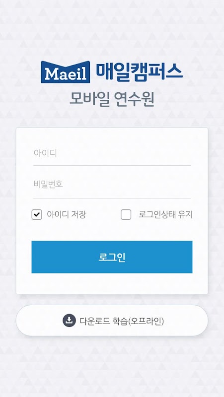 PC환경의 매일캠퍼스 사이버 연수원(http://maeil.hunet.co.kr)의 아이디와 비밀번호로 로그인 가능하며, 주요 서비스를 본 모바일 앱에서도 사용하실 수 있습니다.