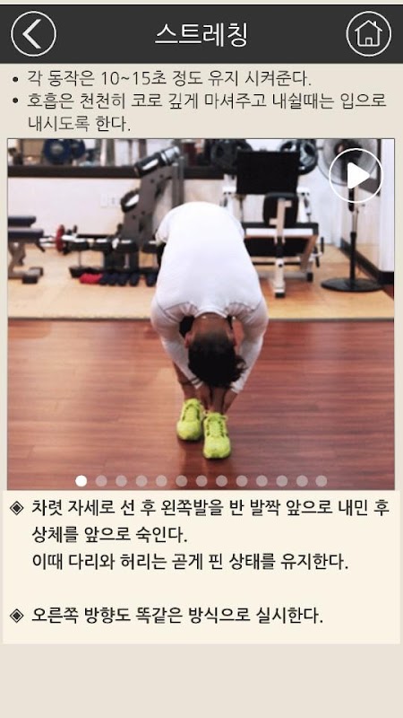 - 스트레칭 - 각 동작 설명과 플레이 버튼 클릭시 그대로 따라 하실수도 있습니다.