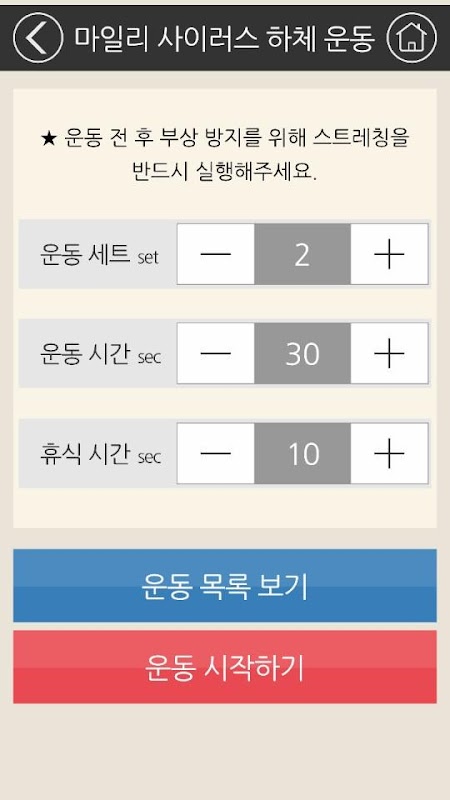 - 운동 리스트 - 운동에 대한 자세한 설명과 주의사항을 운동 영상과 함께 제공합니다. 그리고 하고 싶은 운동을 선택하여 운동할수도 있습니다.
