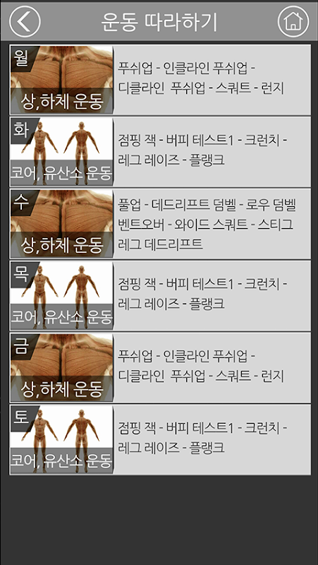 - 초급, 중급, 고급 3단계로 요일별 운동을 제시