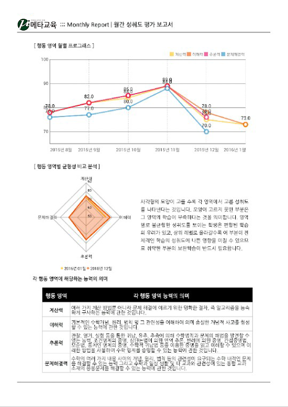 메타교육학원에서는 달마다 아이의 학업 보고서를 작성해 학부모님께 전달합니다. 아이의 문제 풀이 결과를 도표와 그래프 등을 통해 알기 쉽게 정리해서, 아이의 현재 학습 상태를 진단하기 위해서인데요.