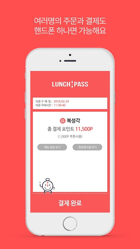 Przełęcz obiad (lunch PASS) jest inteligentny mobilne usługi pieczęć żywności. Lunch jest ścieżka (lunch PASS) Merchants logo restauracje, kawiarnie, itd. Mogą być zawsze stosowane. Miesięczne rozliczenia trudności wynikające z tradycyjnych znaczków papier spożywczych i kartki żywnościowe książek, można rozwiązać taką stratę czasu jako przepustkę lunchu.
