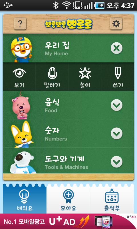 • 모아요 : 열심히 낱말 놀이를 하고 받은 뽀로로와 친구들 배지를 확인할 수 있습니다.