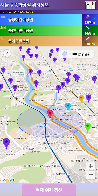 : Ta aplikacja pokazuje informacje o położeniu toalet publicznych zainstalowanych w każdym obszarze Seulu na mapie.