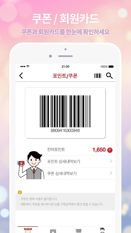 -쿠폰/회원카드: 포인트 적립부터 쿠폰까지 한번에 이용으로 알뜰 쇼핑 하실 수 있습니다.