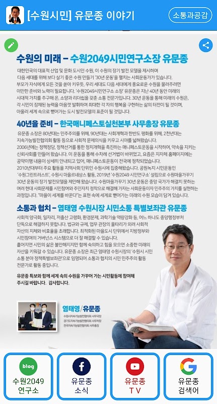 ■ 염태영 수원시장 시민소통 특별보좌관 유문종은 소통과 협치로 활동하고 있습니다.