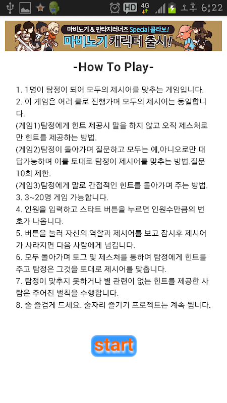 게임이 점점 늘어나 벌써 10가지가 넘었네요. ㅋ 내가 만들었지만 나도 찾기 힘든 이 술자리게임을 용케 찾아서 다운받으신 분들 짝짝꿍하셈. ㅋ