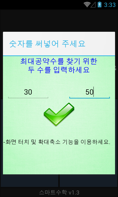원리탐구에 중점을 둔 어플로 최대공약수 학습시에 공약수끼리 곱하면 왜 최대공약수가 나오는지 이해할 수 있게 구성하였습니다.
