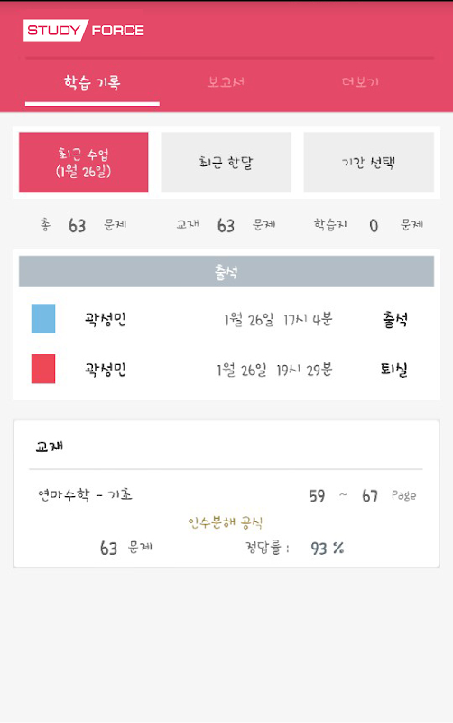 스터디포스학원 학부모 앱입니다. 아이의 출결/학습 상태, 월별 학업 보고서까지 모든 정보들을 앱을 통해 실시간으로 받아보실 수 있습니다.