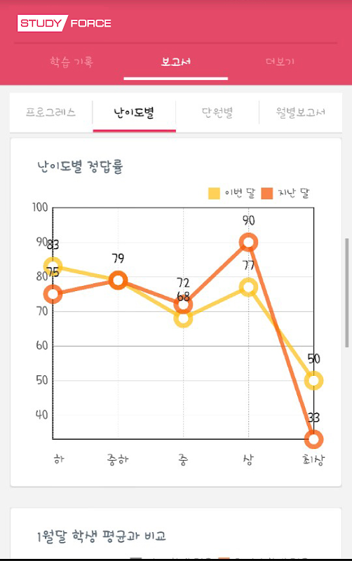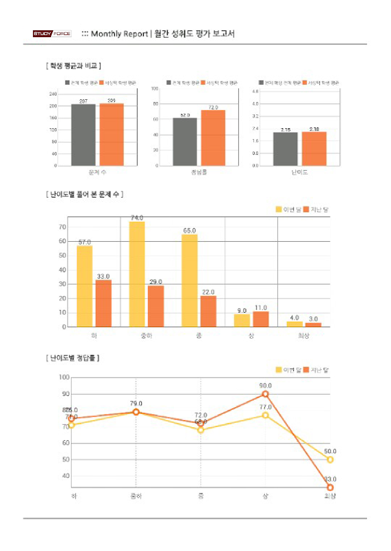 스터디포스학원에서는 달마다 아이의 학업 보고서를 작성해 학부모님께 전달합니다. 아이의 문제 풀이 결과를 도표와 그래프 등을 통해 알기 쉽게 정리해서, 아이의 현재 학습 상태를 진단하기 위해서인데요.