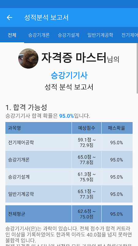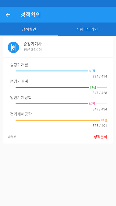 성적확인 - 각 과목별 성적 및 그동안 풀어본 기출문제와 모의고사, 문제풀기의 성적을 볼 수 있습니다.