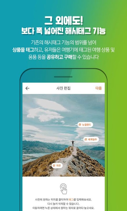 여행기 작성시 해시태그의 기능이 새로이 추가 되었습니다. 기존의 해시태그 기능의 범위를 넘어 상품을 태그하고, 유저들은 여행기에 태그된 여행 상품 및 용품 등을 공유하고 구매할 수 있습니다.
