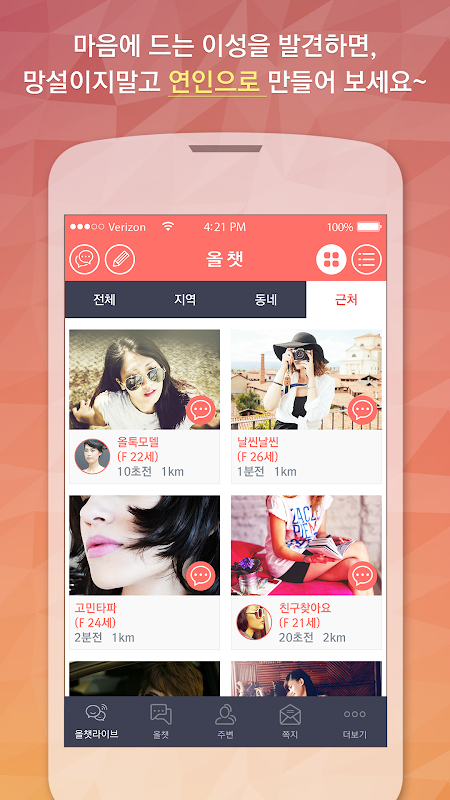 빠르고 간편하게 내 주변 사람들과 대화를 나누거나 셀프 소개팅, 데이트(만남) 약속을 잡을 수도 있으며, 마음에 드는 상대와 1:1로 채팅을 할 수 있습니다.