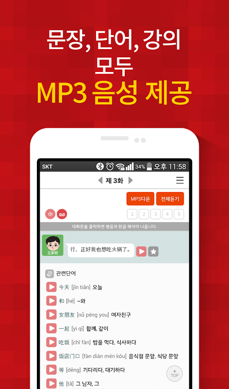 2. 하나의 대화문 화면에서 문장과 병음, 한국어 뜻, 단어, mp3, 녹음이 모두 가능