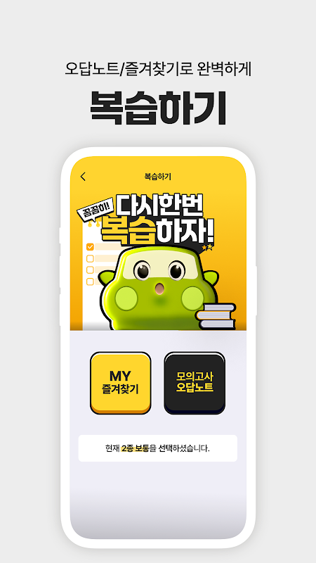- 1종 보통/대형/특수, 2종 보통/소형/원동기 등 시험보는 문제들만 골라서 집중학습!