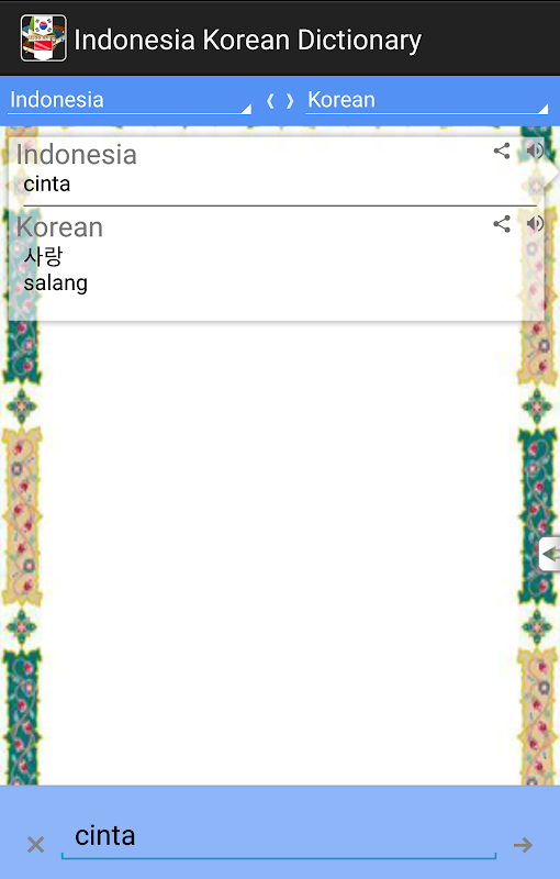 인도네시아어 사전 한국은 주요 기준을 표준 인도네시아어와 한국어 권리를가 된 가장 포괄적 인 사전입니다. 우리는 당신에게 당신은 그냥 터치하고 손가락을 이동하여 액세스 할 수 있습니다 안드로이드에 대한 응용 프로그램 KIK (인도네시아어 사전 한국), 매우 간단하고 거의 모든 시간에 사용됩니다 제시한다. 이 응용 프로그램을 사용하려면 인터넷 연결이 필요합니다.