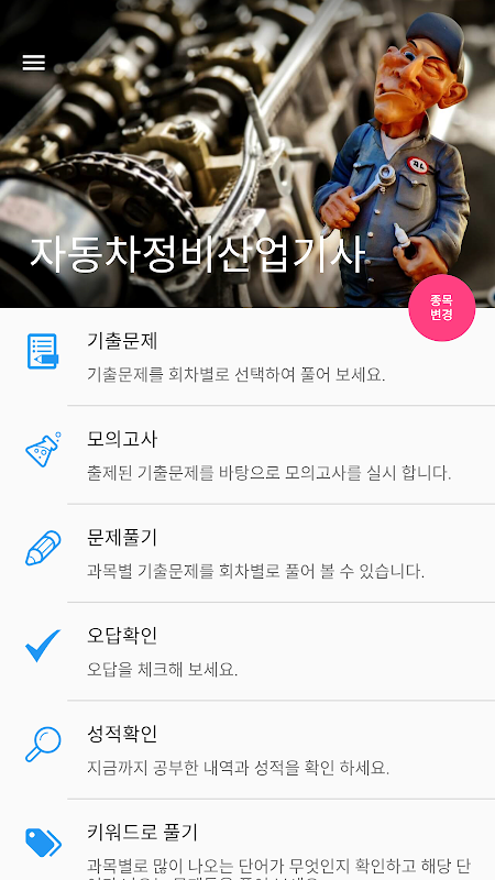 자동차정비산업기사 공부를 위한 필수 앱 입니다.일반기계공학자동차기관자동차새시자동차전기등 과목별로 공부 해 보세요.