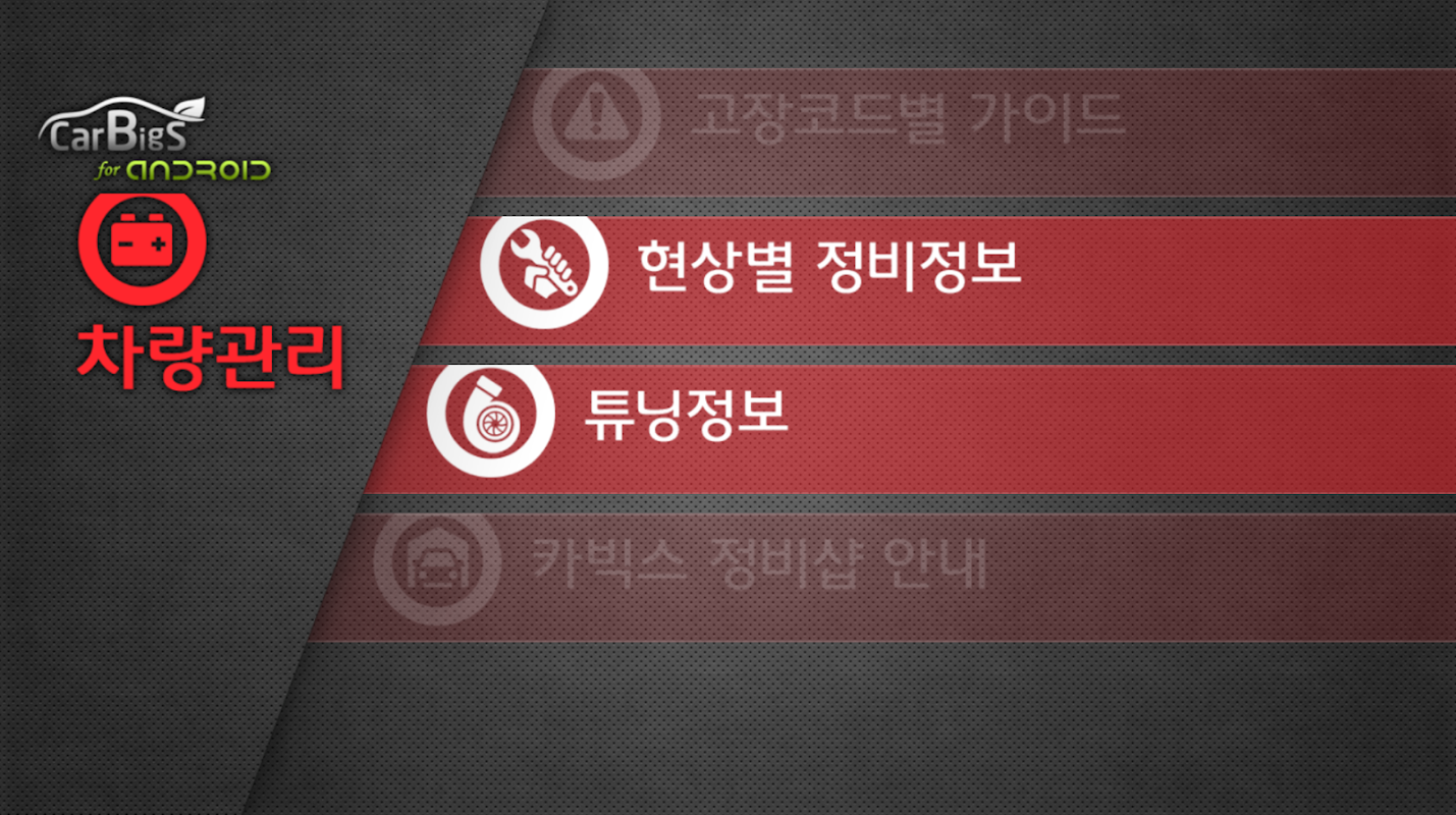 (4) 차량관리정보 : 차량 현상별 정비정보 1,500가지, 차량 튜닝 및 정상화 정보 : 50가지 , 스캐너 고장코드별 차량관리 : 6,000가지