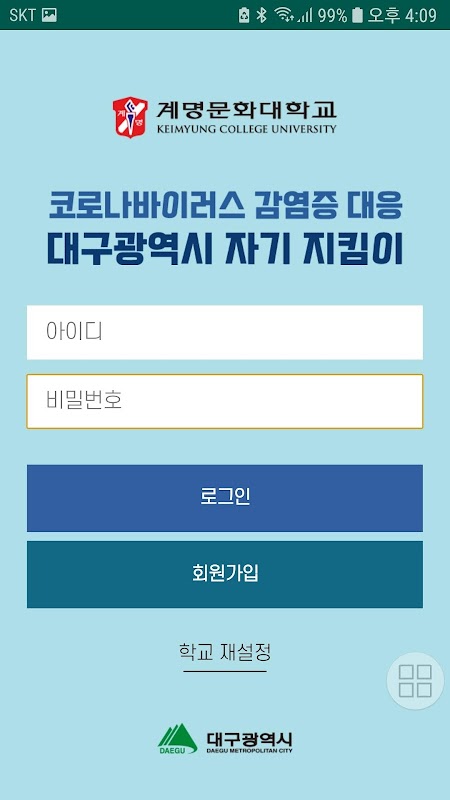 ※ ‘코로나 대구 지킴이’ 앱은 해당 서비스를 이용하는 대학 관계자(대학생, 교수, 교직원)만 이용 가능한 서비스입니다. 대구광역시에서는 코로나19 대응을 위해 학생들에게 코로나19 감염 위험을 주기적으로 알리고, 감염 발생시 신속한 대응이 가능하도록 하기 위해 제공합니다.