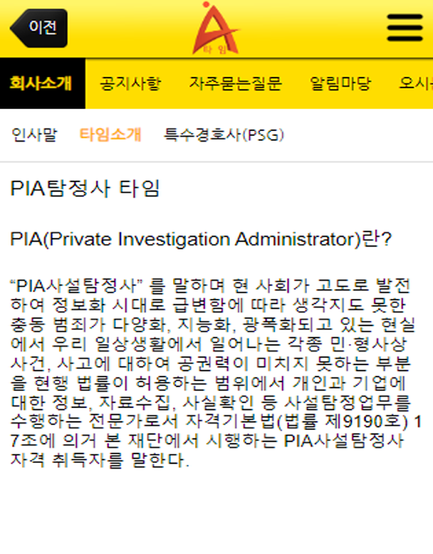 „Pia 사설 탐정사” 를 말 하며 현 사회 가 고도로 발전 하여 정보 화 시대로 급변함 에 따라 생각지도 못한 충동 범죄가 다양 화, 지능화, 광폭화 되고 있는 현실 에서 우리 일상 생활 에서 일어나는 각종 민 민 · 형사상, 사고 에 대하여 대하여 대하여 대하여, 사고 에 대하여 대하여 사건, 사고 에 대하여 공권력이 미치지 못하는 부분을 현행 법률이 허용하는 범위에서 개인과 기업에 대한 정보, 자료수집, 사실확인 등 사설탐정업무를 수행하는 전문가로서 자격기본법(법률 제9190호) 17조에 의거 본 재단에서 시행하는 PIA사설탐정사 자격 취득자를 말한다.