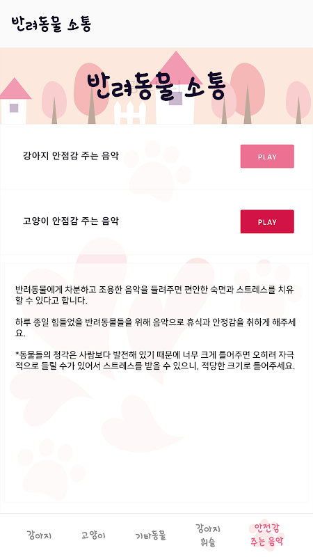 또한 반려동물 전용 음악으로 강아지, 고양이들의 스트레스를 풀어줄 수 있습니다.