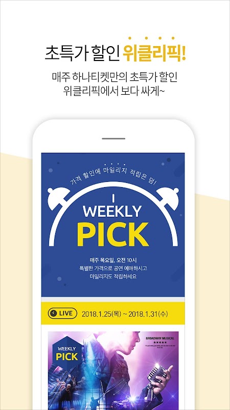 - 주간별 최고의 공연을 선별하여 최상의 할인 혜택 제공 페이지 구성
