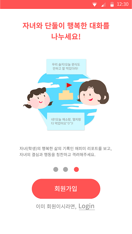 해피미 학부모는 식사,활동,생활 등 자녀의 해피미 건강증진을 지원하기 위한 모바일 서비스입니다.