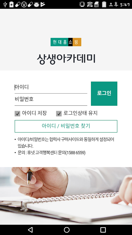 휴넷에서 제공하는 현대홈쇼핑 협력사 임직원을 위한 상생 아카데미 모바일 연수원입니다. PC환경의 현대홈쇼핑 상생 아카데미(partner-ehyundai.hunet.co.kr)의 아이디와 비밀번호로 로그인 가능하며, 교육과정등의 주요 서비스를 모바일앱에서도 사용하실 수 있습니다