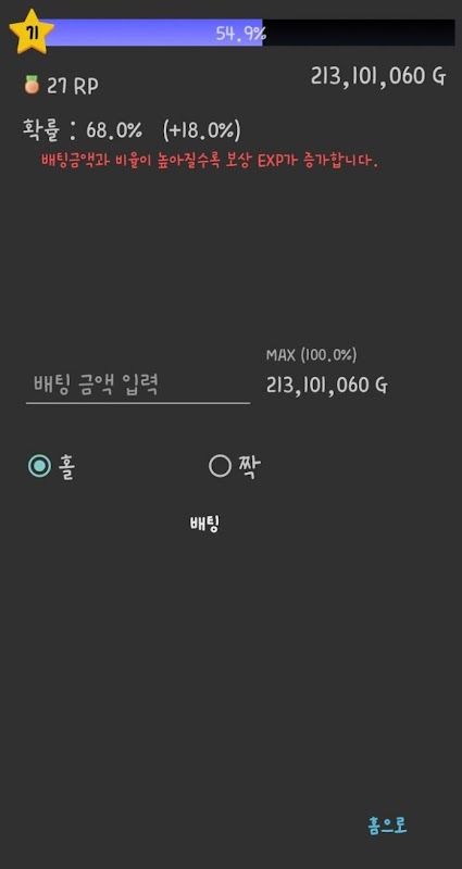 홀짝게임 : 홀짝 게임을 통해 돈을 벌고 레벨을 올려서 각종 확률을 키울 수 있습니다.