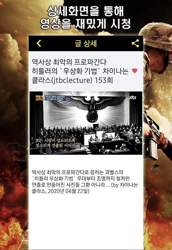 유익하고 재밌는 영상 1500 개를 엄선해 어플에 담았습니다. 때론 전쟁의 참상을, 전쟁이 낳은 영향, 인물에 대해 재밌게 살펴보시기 바랍니다.