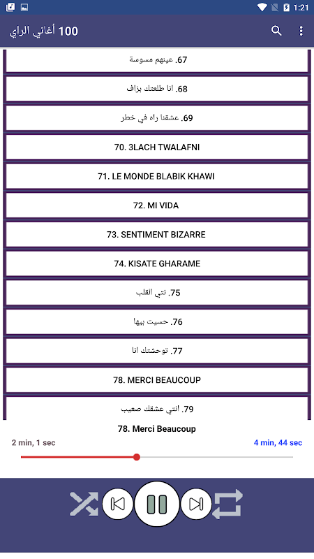 Aplikacja zawiera najbardziej niesamowite piosenki rai bez sieci, gdzie piosenki rai są uważane za piosenki algierskie, więc aplikacja została stworzona z myślą o miłośnikach i miłośnikach piosenek rai i piosenek algierskich bez sieci. pieśni Rai są algierskimi pieśniami ludowymi, ale są również uważane za arabskie i są również uważane za międzynarodowe, ponieważ zyskały szeroką sławę i są uważane za jedną z najpopularniejszych piosenek w arabskim Maghrebie.