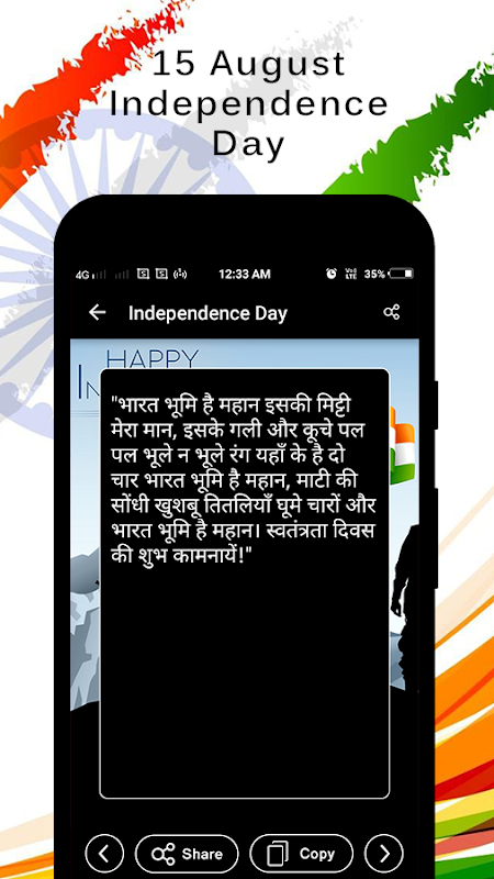 Celebrate this year Happy Independence day with this App & share Joy, Peace & Happiness together with your family and friends by sharing Happy Independence day Wishes.