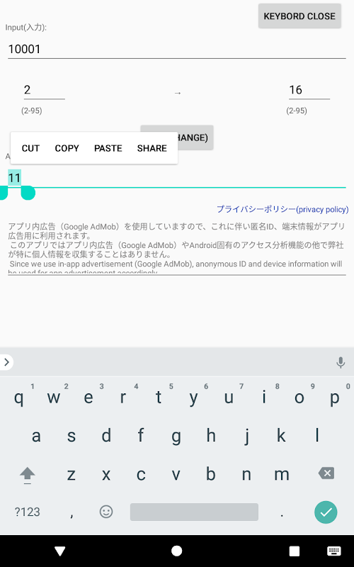 Dzięki tej aplikacji możesz łatwo przekonwertować liczby binarne na 95 na inne liczby podstawowe. Powszechnie używane liczby podstawowe, takie jak liczby binarne, liczby dziesiętne, liczby szesnastkowe i liczby 36 podstawowe, można płynnie konwertować.