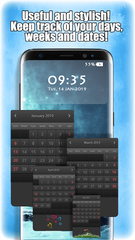 Żadna inna aplikacja kalendarza 2019 jest tak oryginalne i użyteczne jako tego miesiąca kalendarzowego widżet, który jest uroczo animowanego. Więc śmiało, dostać to pobieranie kalendarza i najlepsze darmowe "widżet kalendarza" dla Androida wreszcie będzie twoje. Jeśli chcesz przezroczyste widżet kalendarza do dekoracji tapety gif, ten "wolny kalendarz" oczaruje Cię z uroczych animacji pływających różowe kwiaty lub zwykły śniegu.
