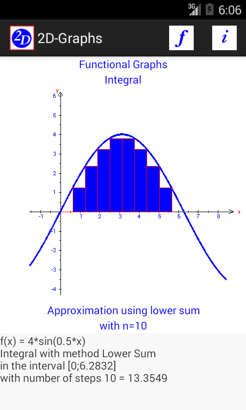 Aplikacja 2D wykresy daje graficzną reprezentację funkcjonalnej wykresy typu f (x) lub (x (t), y (t)). Składa się on z obliczeń skrzyżowań zer i ekstremów. Jeden specjalne jest opracowanie integralnego rozdzielczości z wielu metod. Wśród nich są górne i dolne kwoty, trapez i metoda Simpsona, wykazując zbliżoną do wartości całkowitej. Ponadto obszar betwenn tych wykresów można obliczyć. Dla każdego wykresu, można określić lokalizację, w której program oblicza nachylenie i rysuje odpowiedni styczną.