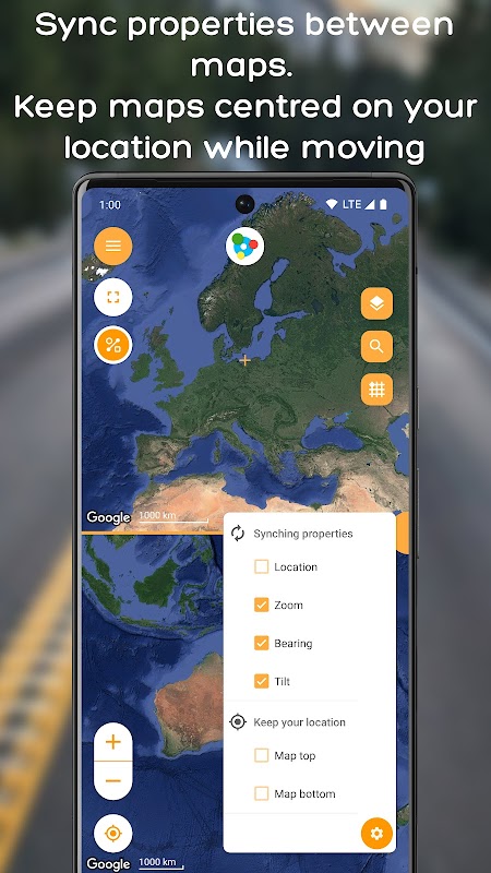 • Porównaj poziomy powiększenia: wybierz lokalizację do wyświetlenia na każdej mapie z różnymi poziomami powiększenia. Ta funkcja jest pomocna w monitorowaniu Twojej bieżącej lokalizacji i ogólnej pozycji podróży