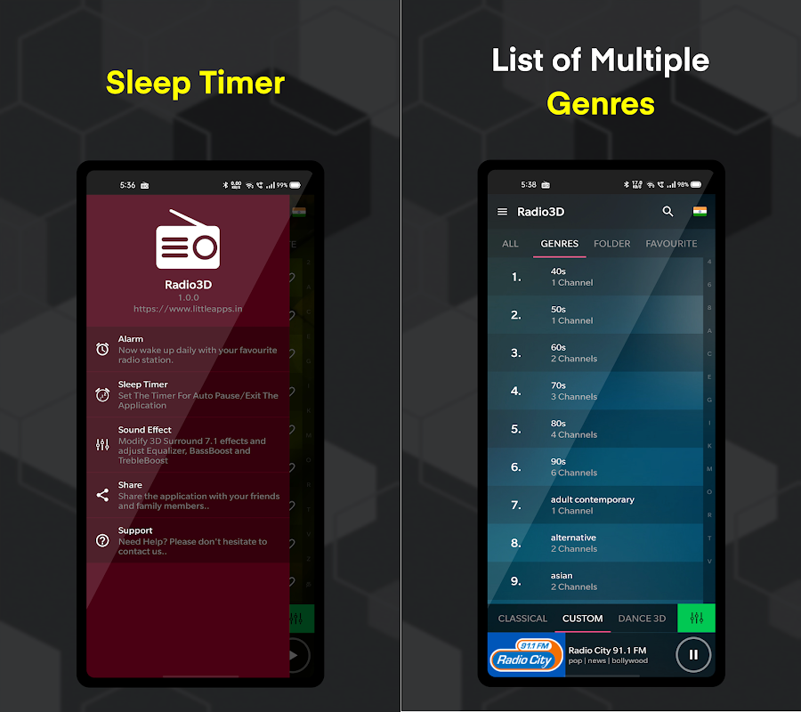 🎶 Efekty dźwiękowe - Po raz pierwszy udało nam się stworzyć aplikację 3D Radio, której nigdy wcześniej nie widziałeś. Użytkownicy mogą dodawać różne efekty dźwiękowe podczas słuchania każdego kanału. Ogólnie rzecz biorąc, żadne aplikacje Radio nie pozwalają na dodawanie dodatkowych efektów dźwiękowych, w tym efektów 3D Surround 7.1 w stacjach muzycznych na żywo, ale tak jest.