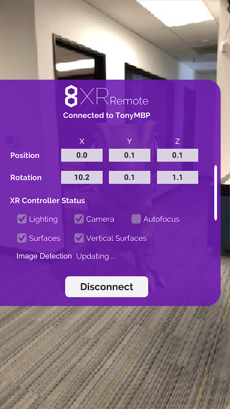 8-ta Ściana XR Remote pozwala na podgląd i testy AR aplikacje bezpośrednio w środowisku programistycznym na komputerze bez konieczności kompilacji i wdrożyć go do urządzenia. Okazuje Android urządzenia do zdalnego sterowania, który strumieni danych do komputera i rozwoju, takie jak akcenty, kamerę obrazu, pozycji kamery (6DOF), pole widzenia, akcelerometr, żyroskop, magnetometru i teledetekcji środowiska danych (np poziomu światła, wykrywany powierzchnie i punkty kontrolne).