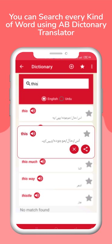 Dostępne jest również tłumaczenie zdań offline! Ciesz się tłumaczeniem całkowicie offline z ponad 70 języków. AB Dictionary zawiera oryginalnie opracowane słowniki, Collins Advanced Dictionary, WordNet Dictionary, natywne przykłady, synonimy, antonimy i tak dalej. Zapewnia również angielskie filmy, gry i quizy, które pomogą ulepszyć Twój słownik English.AB to znacznie więcej niż zwykły słownik! Bez wysiłku tłumacz teksty, obrazy lub rozmowy w 108 językach. Spełnia wszystkie Twoje potrzeby związane z tłumaczeniem, w tym studiowanie, pracę i podróże za granicą. Uczysz się angielskiego lub urdu i chcesz poznać znaczenie prawdziwej czcionki urdu lub angielskiego z tłumaczeniem rzymskim? Następnie aplikacja (angielski na Urdu Dictionary) jest najlepsza dla Ciebie. Offline Urdu English Roman Dictionary to aplikacja do nauki słownika dla wszystkich użytkowników, którzy chcą uczyć się języka angielskiego. Darmowy słownik z angielskiego na urdu może być używany do nauki tłumaczenia i wymowy z angielskiego na urdu. Aplikacja (AB) nadaje znaczenia z urdu na angielski i rzymskiego na angielski lub urdu, ale aplikacja słownika urdu i angielskiego zapewnia również wspólną funkcjonalność znaczeń słów z angielskiego na urdu. Dlatego ci, którzy chcą znaleźć znaczenia w konwencjonalny sposób, mogą znaleźć znaczenia angielskich słów w języku urdu w tym słowniku, tak jak w słowniku angielskim. 100% bezpłatna aplikacja słownika zawiera funkcje English Dictionary Offline i Urdu Dictionary Offline. Ma wbudowaną czcionkę Urdu, która nie wymaga żadnej dodatkowej funkcji Urdu na twoim urządzeniu. Kompletny słownik urdu na angielski działa tak samo, jak trener z urdu na angielski z obsługą tłumaczenia rzymskiego. Możesz także powiedzieć jego słownik urdu. Najlepszy słownik urdu angielski jest przeznaczony dla osób, które wiedzą o urdu i chcą nauczyć się języka angielskiego, jest to najlepszy słownik urdu na angielski z dużą ilością słów. Jeśli czytasz angielskie książki, oglądasz filmy z napisami lub widzisz dowolne słowo w dowolnym miejscu i chcesz poznać jego znaczenie, otwórz słownik angielsko-urdu. Słownik urdu angielskiego zapewni Ci wszystkie podstawowe potrzeby Twoich codziennych potrzeb językowych i sprawi, że Twoje potrzeby będą łatwiejsze, wygodne i zabawne. Funkcje tłumacza słownika AB: