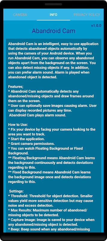 Po uruchomieniu Abandroid Cam możesz obserwować porzucone obiekty poza tłem na ekranie. Możesz także wykryć brakujące obiekty, jeśli takie istnieją. Ponadto możesz preferować dźwięk alarmu. Alarm włącza się w przypadku wykrycia porzuconego obiektu.