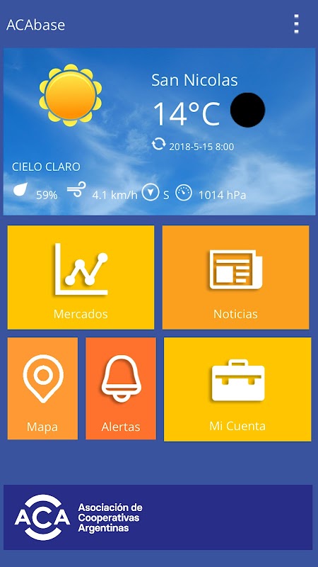 ACAbase movil z Argentyny Spółdzielni Stowarzyszenia, umieszcza informacje w zasięgu ręki, aby strategiczne interesy i podejmować właściwe decyzje we właściwym czasie, mobilności i wszechobecności dynamicznego firm, informacji i usług, gdzie użytkownik wymaga, prognoza pogody rolnicze do 3 dni dostępny rynku towarowego ceny i przyszłe wiadomości krajowe i międzynarodowe oraz klucz podejmowania decyzji.