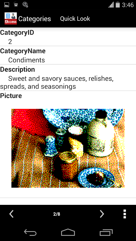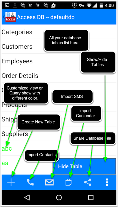 Otwarcie bazy danych programu Microsoft Access na Android urządzenia z Menedżera dostępu do bazy danych, można je łatwo przeglądać Zoom, Sortowanie i stronicowania. Można również edytować je bezpośrednio w telefonie lub na podkładce z in-app zakupu funkcji "Zmień dane".