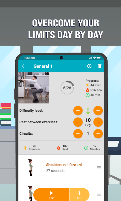 Dzięki naszej aplikacji możesz zapobiegać problemom zdrowotnym wynikającym z powtarzalnej pracy lub długotrwałej statycznej pozycji w miejscu pracy. Możesz ćwiczyć w dowolnym miejscu, bez sprzętu.