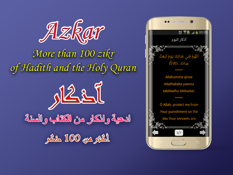 - عرض التلقائي للأذكار (الاستيقاظ ، صباح ، مساء والنوم) مع إمكانية ضبطها.