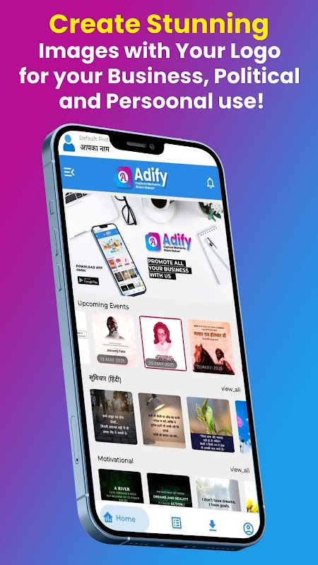 **Adify** – एक ऐप जो आपको जीवन के हर पल को व्यक्तिगत रूप से साझा करने का अवसर देता है। यहाँ आप अपने सुविचार, विचारों, और उद्धरणों को अपने नाम और फोटो के साथ शेयर कर सकते हैं।